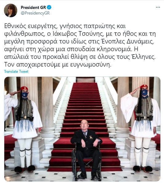 «Δίχως Πατρίδα, ούτε ο πλούτος, ούτε η δόξα, ούτε οι χαρές υπάρχουν». ΙΑΚΩΒΟΣ ΤΣΟΥΝΗΣ, Υποστράτηγος επί Τιμή! Άνθρωπε, Έλληνα, Αγωνιστή, Ευπατρίδη, Μέντορα, Φίλε μου…..καλό σου Ταξίδι!! Να ‘ναι ελαφρύ το Ελληνικό χώμα που θα σε σκεπάσει!! Η Πατρίς σε ευγνωμονεί!!!»