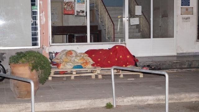 Μονίμως λοιπόν το τελευταίο διάστημα η είσοδος έχει μετατραπεί σε υπαίθριο… Ξενοδοχείο. Αστεγοι άνθρωποι, αρκετές φορές αθίγγανοι, αλλά όχι μόνο, καταφεύγουν εκεί για να περάσουν την νύχτα τους, χρησιμοποιώντας για… στρώμα παλέτες ξύλων από μεταφορές υλικών στον Σύνδεσμο πολυτέκνων.