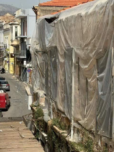 Έλα τώρα υπερβολές. Θα μπορούσε αντί για τα σίδερα της τέντας να φύγει ένα κομμάτι από το νεοκλασικό ερείπιο, που επειδή δεν μπορούν να το επισκευάσουν οι ιδιοκτήτες του, ο Δήμος με δικά μας έξοδα έκανε μια στοά, η οποία για προσέξτε τι έχει ήδη στο ταβάνι της;