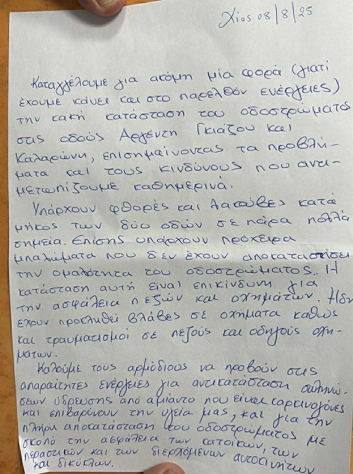 Ακόμα επισυνάπτουμε την καταγγελία των κατοίκων στις Τεχνικές Υπηρεσίες του Δήμου στις 8/8/2025 που χάρις αυτής κινητοποιήθηκαν οι υπηρεσίες και ασφαλτοστρώθηκε ένα κομμάτι της Αργέντη (Γκιάζου).