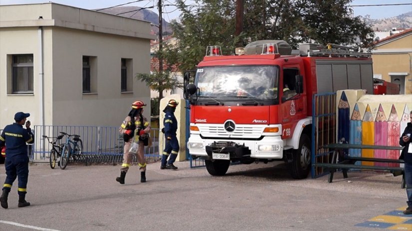 Επειδή λοιπόν σύμφωνα με το σενάριο… έπεσε το κτίριο του 3ου και 8ου Δημοτικών Σχολείων και έπρεπε η Πυροσβεστική να απεγκλωβίσει ένα παιδί, προσέγγισε το Πυροσβεστικό όχημα, πλην όμως… δεν χωρούσε από την πόρτα!