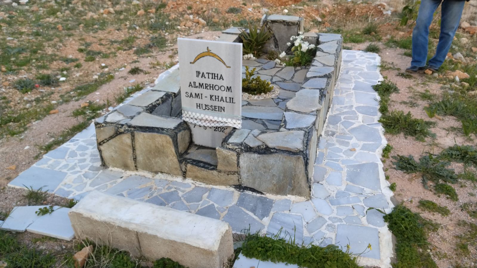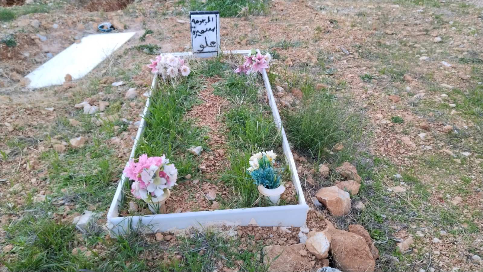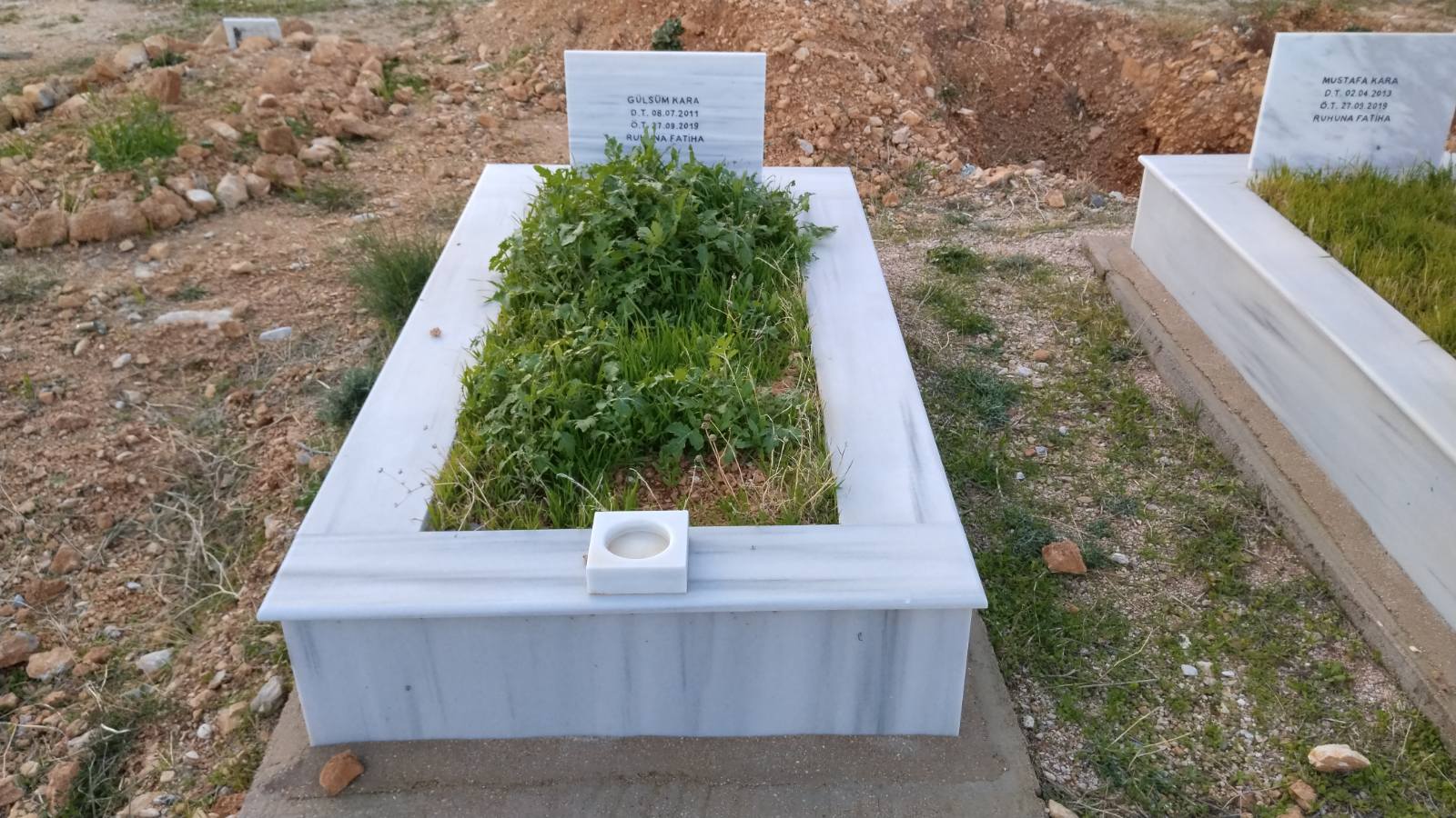 Να ένα τάφος… πολυτελείας. Σαν τα κρύα τα νερά πρέπει να ήταν η Φατμέ. Η χρονολογία στην πέτρα μας λέει πως δεν πρόλαβε να κλείσει τα 20. Ο, ή οι αγαπημένοι της στόλισαν τον τάφο με… στοργή από πέτρες. Έχουν οι πέτρες στοργή; Μα εδώ είχαν μέχρι και το μαντήλι, που κάποτε φόραγε στο λαιμό ή στο κεφάλι της περασμένο σε ένα αυτοσχέδιο βάζο. Δίπλα της ένας τάφος με… τίποτα πάνω του. Απλά για ταφική οριοθέτηση υπήρχε ένα ημικύκλιο με πέτρες. Στη μέση ένα σπασμένο μάρμαρο, περίσσευμα από δικό μας τάφο. Στη γή ένα δίχρονο παιδί.