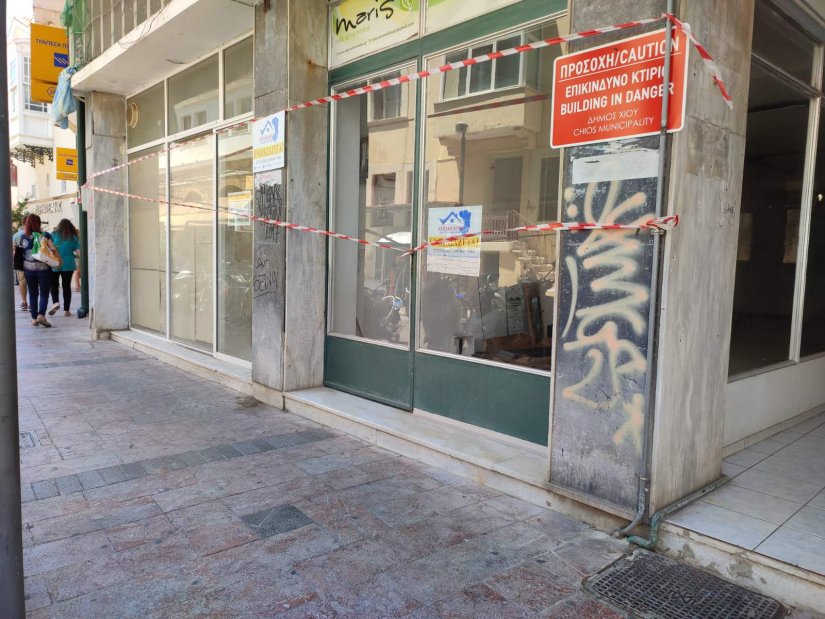 Η Τεχνική υπηρεσία του Δήμου τοποθέτησε μια πινακίδα ότι το κτίριο είναι επικίνδυνο και έβαλε και μια κορδέλα, μπροστά στο ξενοίκιαστο ισόγειο κατάστημα.