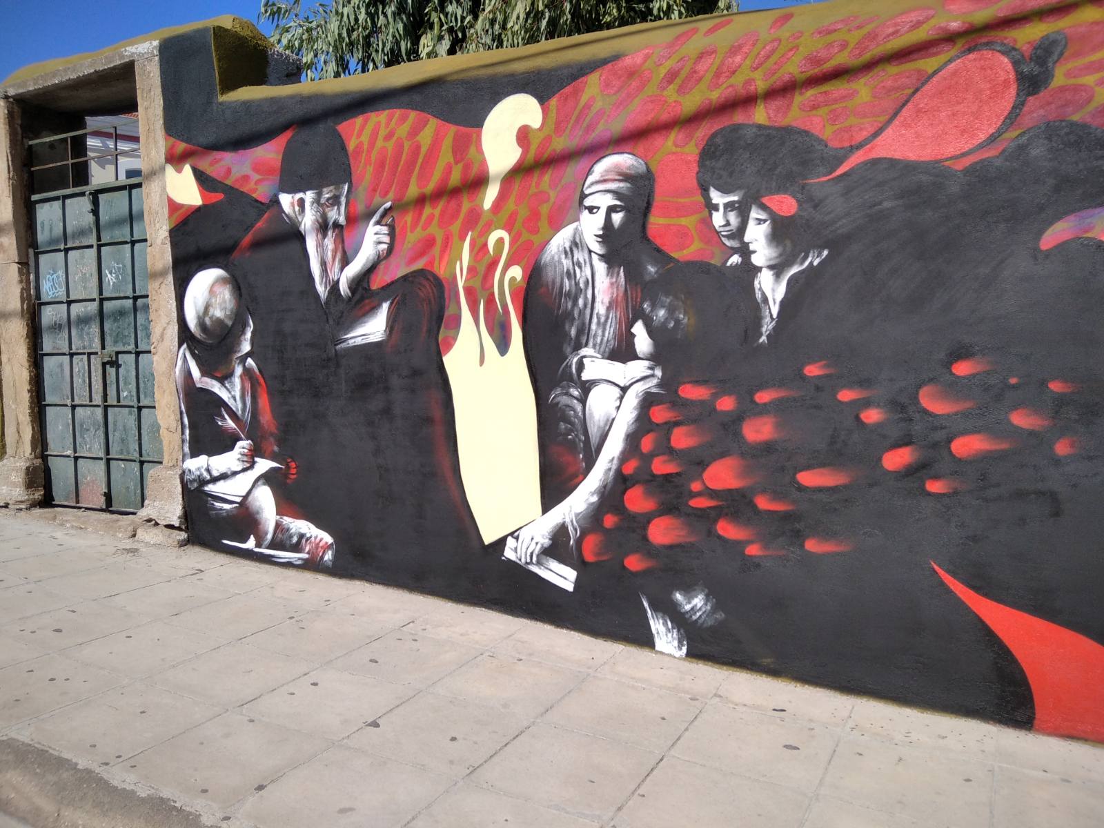 Ένα Δημοτικό Σχολείο επέστρεφε από μια εκδρομή, οι μικροί άφησαν φεύγοντας το πρωϊ έναν «μουσταρδί» τοίχο έξω από το 1ο Γυμνάσιο και γυρίζοντας είδαν αυτό που έβλεπα και εγώ βγαίνοντας από την Βιβλιοθήκη!