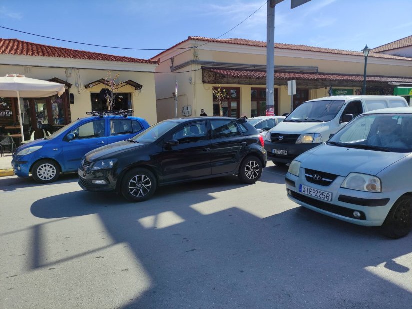 Ας γυρίσουμε όμως στα δικά μας και συγχωρήστε μου τον τίτλο, κοιτώντας με προσοχή την φωτογραφία. Την τράβηξα Μεγάλη Τρίτη στις 11.00 π.μ. έξω από του Κιοσκεριάν στην οδό Δημοκρατίας, όπου η κυκλοφορία σαν τον «κάβουρα» διεξάγονταν μετ’ εμποδίων γιατί ο ένας νεοέλλην του μπλε Ι.Χ. διπλοπαρκάρισε και… έφυγε. Όπως το διαβάζετε. Έμεινα εκεί μισή ώρα περιμένοντας. Ο τύπος είχε πάει μάλλον στο ΚΕΠ ή κάπου στον Δήμο ή τον ΟΤΕ, τελείωσε την δουλειά του, μπήκε μέσα και έφυγε. Ο πίσω με το ημιφορτηγό, είδε τον πρώτο τράβηξε και εκείνος χειρόφρενο και με το πάσο του, ξεφόρτωνε εμπορεύματα στα μαγαζιά.