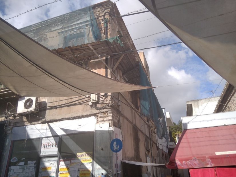 Ένα ερείπιο έτοιμο να σωριαστεί, κάποια σάπια ξύλα περιμετρικά, πρώην λινάτσες και τώρα κουρέλια, που κρέμονται πάνω από τα κεφάλια των ανθρώπων, τέντες, αφίσες σε τζάμια, καλώδια, ξεχασμένα κλιματιστικά, εικόνα που παραπέμπει σε υποβαθμισμένη συνοικία της Βηρυτού, της Βασόρας, άντε της Προύσας πάντα… εκτός κέντρου.