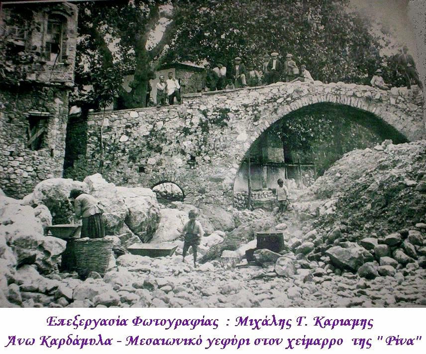Το παλιό Γενοβέζικο γεφύρι, που έδινε πρόσβαση πάνω από τον ποταμό Ρίνα, έπεσε προ του 1822. Μετά την επιστροφή των φυγάδων της σφαγής, το επισκεύασαν, για να το κατεδαφιστεί τελικά το 1947.Το όλο αμυντικό έργο, περιλάμβανε υπόγειες δεξαμενές ύδρευσης, αποθήκες, καθώς και σήραγγες διαφυγής. Προ ολίγων ημερών, κατόπιν ενεργειών και εξόδων του εκλεκτού τέκνου αυτού του τόπου, καπετάν Αλέκου Εμ. Καραμούζου και με οδηγό την στοματική παράδοση, οι σήραγγες εντοπίσθηκαν και ερευνούνται. Υπάρχουν αναφορές για την ύπαρξη τριών πηγαδιών κάτω από τη σημερινή κεντρική πλατεία . Υπάρχουν αναφορές ότι στο ένα από αυτά υπάρχει χαραγμένο το όνομα κάποιου Ιουστινιάνη της ‘’ Μαόνα ‘’. Όπως θυμούνται οι συνομήλικοι μου, οι παππούδες τους , τους έλεγαν ότι είχαν ακούσει πως το χωριό τότες, είχε δεκάξι ξεχωριστές γειτονιές ή ενορίες αντίστοιχες με τα παλιά «Χωρίδια». Δηλαδή, τα γένη των οικογενειών και τους διάσπαρτους ανά την Καρδαμυλία χώρα μικρούς οικισμούς και χωριουδάκια. Αργότερα έμειναν τα εξής γένη : Ασπιώτες, Βαγιάνοι, Λυγνοί, Μακρηνοί, Μέληδες , Μόσχοι, Φραγγιάδες και Χαρκιάδες. Η κατάσταση αυτή, επικρατούσε ως την ‘’Σφαγή της Χίου’’ το 1822. Μετά τη συμφορά έμειναν τέσσερες γειτονιές. Τα Γλύφτικα, Κυμινάδικα, Νικολούδικα και Πονηράδικα από τις οποίες κάθε μια εξέλεγε και από ένα «Γέροντα».
