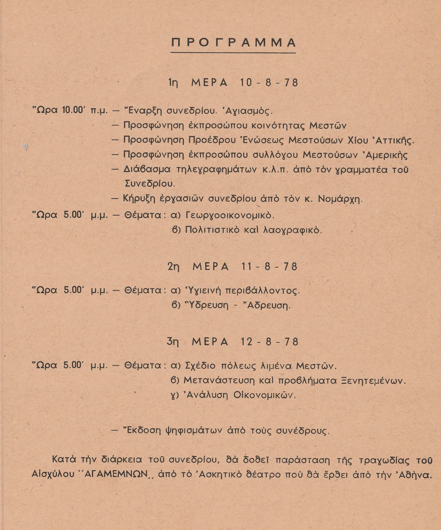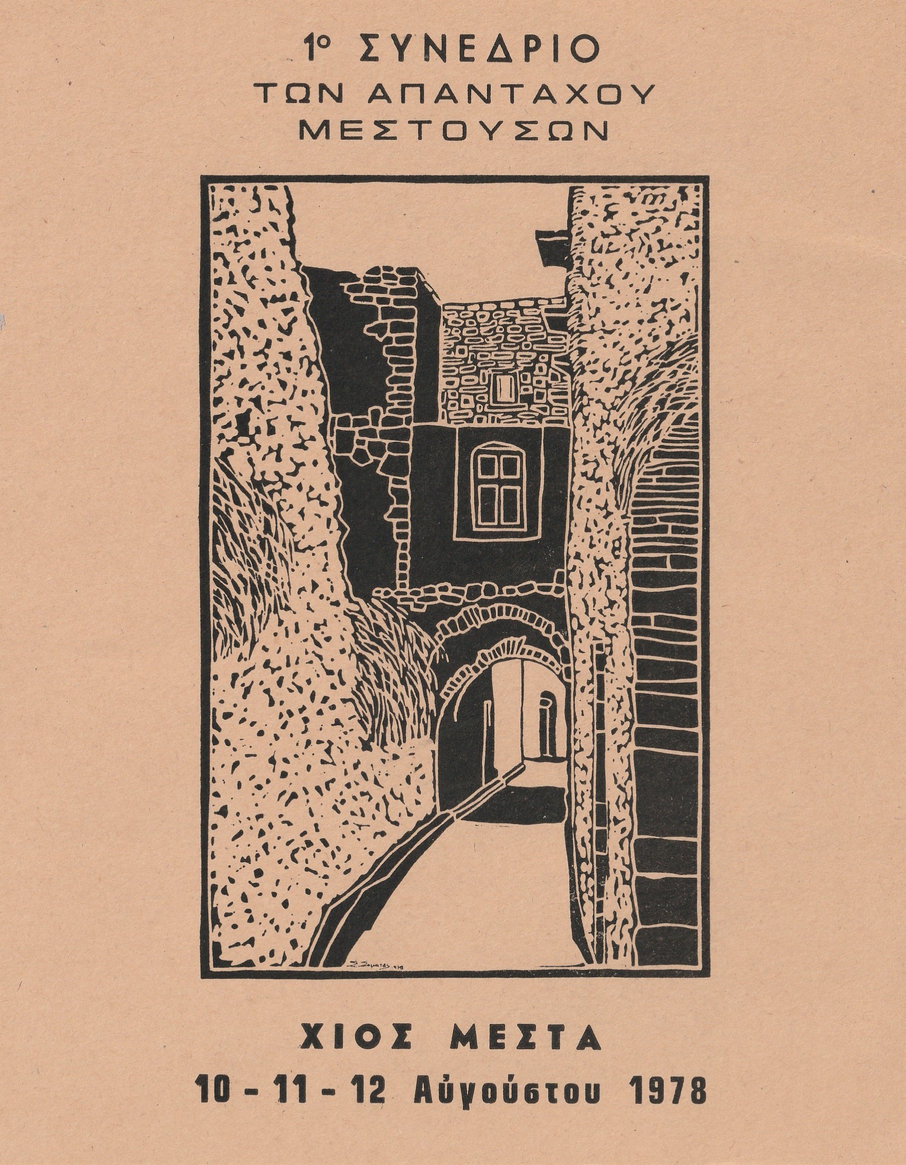 Τα χρόνια περνούν. Η ζωή συνεχίζεται με τα πάνω της και τα κάτω της, με κάθε λογής εκπλήξεις. Έτσι, το καλοκαίρι του 1978 με επισκέπτεται στο γραφείο μου στην Εμπορική Τράπεζα στην Αθήνα, ο τότε πρόεδρος του Συλλόγου Μεστουσών Αττικής, Μιχάλης Μουστρίδης. Με ευγένεια και σεμνότητα, μου ζητά να δημιουργήσω μια αφίσα και το πρόγραμμα του συνεδρίου που θα πραγματοποιείτο στα Μεστά. Ο χρόνος πιέζει. Επιλέγω ένα από τα σχέδιά μου, το χαράζω και το τυπώνω. Έτσι, κυκλοφορεί η αφίσα και το πρόγραμμα για το 1ο Συνέδριο των Απανταχού Μεστουσών, 10-11-12 Αυγούστου 1978 με θέμα το γνωστό τοπόσημο του χωριού την «Κασούλα», η οποία έτυχε μεγάλης αποδοχής και πολλαπλών επαίνων. Αναρτήθηκε όπου έπρεπε στα Μεστά και στη Χώρα και το πρόγραμμα διανεμήθηκε σε όλους τους συνέδρους. Όπως με πληροφόρησε αργότερα ο πρόεδρος του Συλλόγου, τόσο η αφίσα όσο και το πρόγραμμα συνέβαλλαν καθοριστικά στη γνωστοποίηση του Συνεδρίου και κατά κάποιο τρόπο και στην επιτυχία του.
