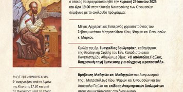Η Ιερά Μητρόπολη Χίου, Ψαρών & Οινουσσών, ο Δήμος Οινουσσών και ο Σύλλογος «Φίλοι Οινουσσών» καλούν στον πανηγυρικό εορτασμό του πρωτοκορυφαίου...