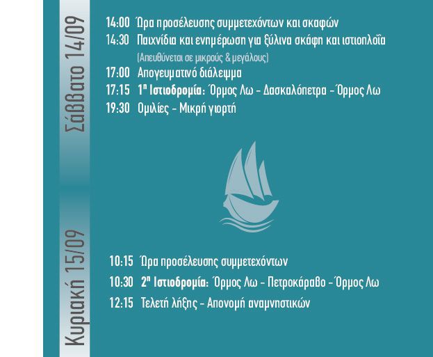 Προσκαλούµε όλο τον κόσµο να αγκαλιάσει αυτή την προσπάθεια και να βρεθεί στις εγκαταστάσεις της Π.Ε.Κ.Ε.Β. στον Όρµο Λω το Σαββατοκύριακο 14-15 Σεπτεµβρίου 2019, ώστε να δει από κοντά µερικά πολύ σπάνια και ιδιαίτερα σκάφη αλλά και για να απολαύσει το ιστιοπλοϊκό θέαµα.