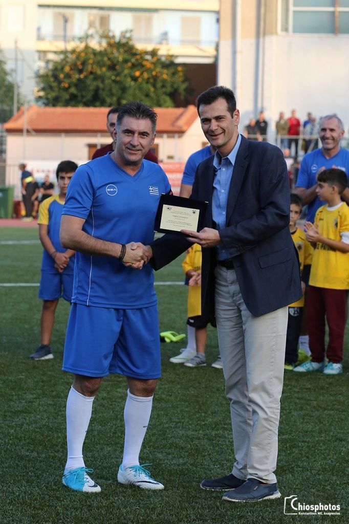 Οι ήρωες του 2004, επίλεκτοι ποδοσφαιριστές της Εθνικής Ελλάδος, που κατέκτησε τότε το Ευρωπαϊκό Κύπελλο και έκανε υπερήφανη όλη την Ελλάδα, έπαιξαν μπάλα την Τετάρτη 24-10-2018 στο Δημοτικό Στάδιο Χίου, στα Μεζάρια, σε έναν ποδοσφαιρικό αγώνα φιλανθρωπικού χαρακτήρα και είχαν απέναντί τους επίλεκτους χιώτες ποδοσφαιριστές της Χίου. Ο αγώνας έληξε 4-2 υπέρ των επίλεκτων διεθνών. Η Μεικτή Χίου προηγήθηκε στο πρώτο ημίχρονο με δύο γκολ των Ντουμάνη και Ζαμπετάκη, ενώ το πρώτο γκολ από τους θρυλικούς παίκτες του 2004 πέτυχε ο Βασίλης Τσιάρτας, που είχε συγκλονίσει τα πορτογαλικά γήπεδα με το ''μαγικό'' αριστερό του πόδι. Στην επανάληψη, ο Τάκης Φύσσας ισοφάρισε σε 2-2 και ο Θοδωρής Ζαγοράκης με δύο ακόμη τέρματα έδωσε τη νίκη στους διεθνείς ποδοσφαιριστές.