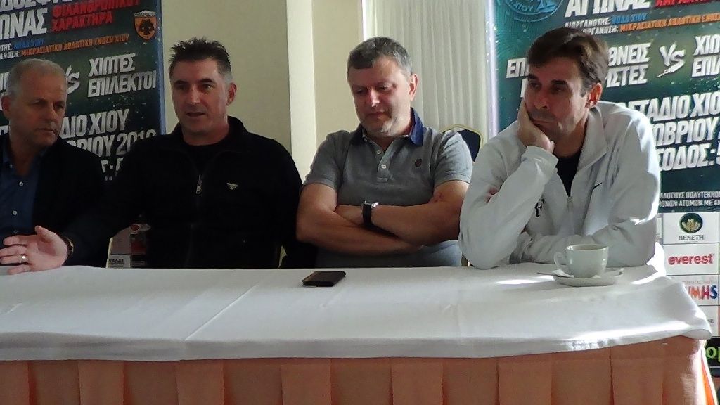 Προηγήθηκε συνέντευξη τύπου των Θοδωρή Ζαγοράκη, Στρατή Αποστολάκη και Βασίλη Τσιάρτα εκ μέρους των διεθνών μας, του Παντελή Καμπούρη εκ μέρους του Νομικού προσώπου του Δήμου, εκπροσώπων της Μικρασιατικής, που είχαν την πρωτοβουλία του φιλικού αγώνα, για την ενίσχυση των Συλλόγων Πολυτέκνων, Τριτέκνων και του Συλλόγου Γονέων και Κηδεμόνων ΑμεΑ και του συμπατριώτη μας Μάρκου Λαγού, που συνέβαλε τα μέγιστα για να γευτεί όλο το νησί την παρουσία των διεθνών ποδοσφαιριστών μας.