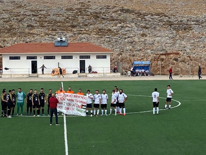 Έτσι στον χθεσινό στον ποδοσφαιρικό αγώνα ανάμεσα σε Λαγκαδά και Φάρκαινα στο νησί της Χίου οι δύο ομάδες σήκωσαν μαζί πανό με σύνθημα "το δίκιο χαραγμένο στων λαών τη μνήμη, νίκη στον αγώνα που δίνει η Παλαιστίνη".