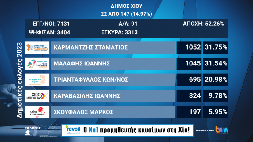 Αυτοδιοικητικές εκλογές 2023Κυρ, 08/10/2023 - 21:08 Στο 15% του Δήμου Χίου πρώτοι Στ. Κάρμαντζης - Γιάννης Μαλαφής.