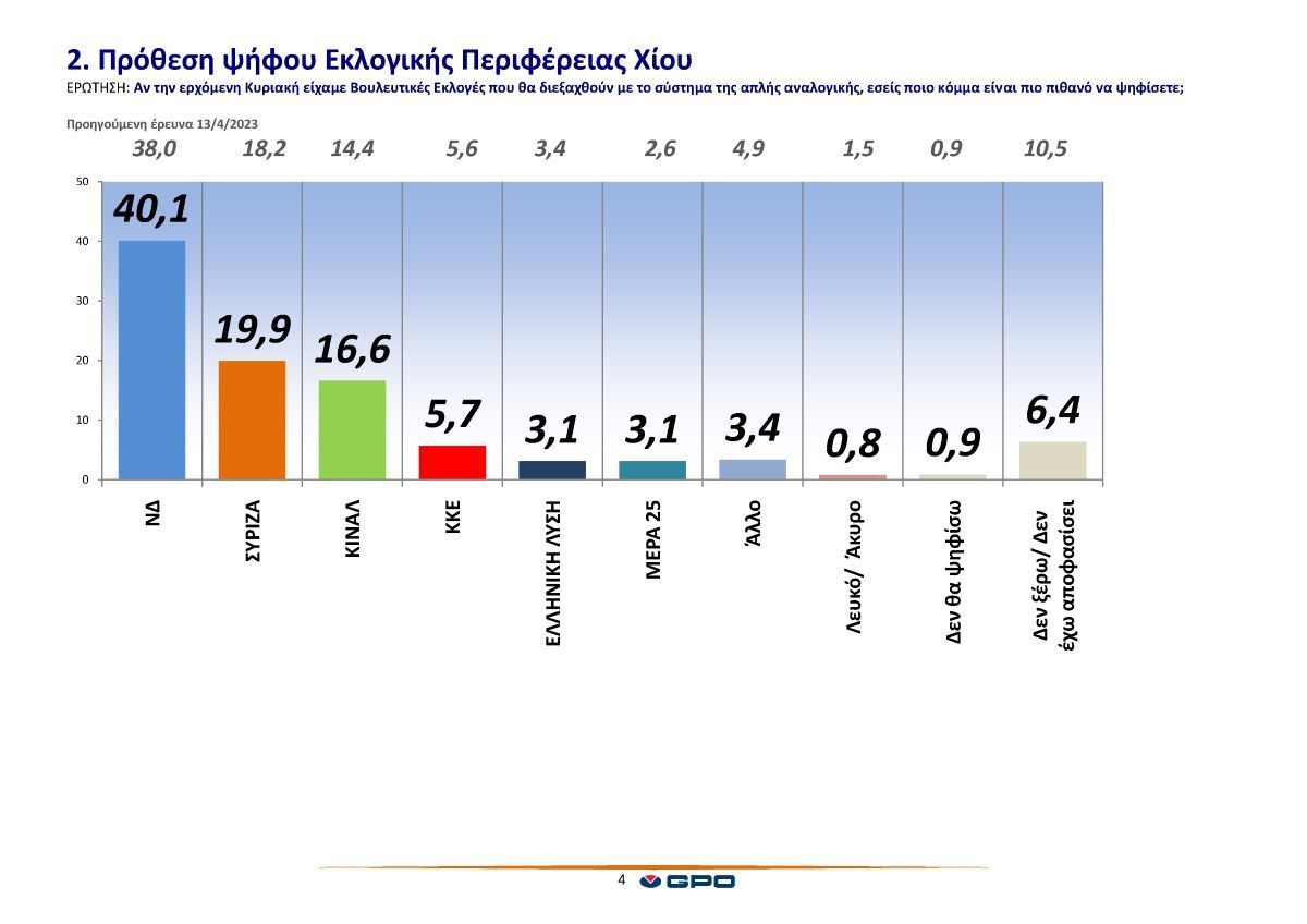 Συγκεκριμένα, σύμφωνα με την έρευνα της GPO, που και πάλι έγινε σε δείγμα 600 ατόμων την περασμένη Πέμπτη 27/4 και Παρασκευή 28/4/23, η Νέα Δημοκρατία χάρη στη συσπείρωση των ψηφοφόρων της, «σπάει» το ψυχολογικό όριο του 40% σε αυτή τη δημοσκόπηση απέχοντας, με το 40,1% που συγκεντρώνει, συνολικά 20,1 μονάδες διαφορά από τον ΣΥΡΙΖΑ που έχει στην πρόθεση ψήφου 19,9%.