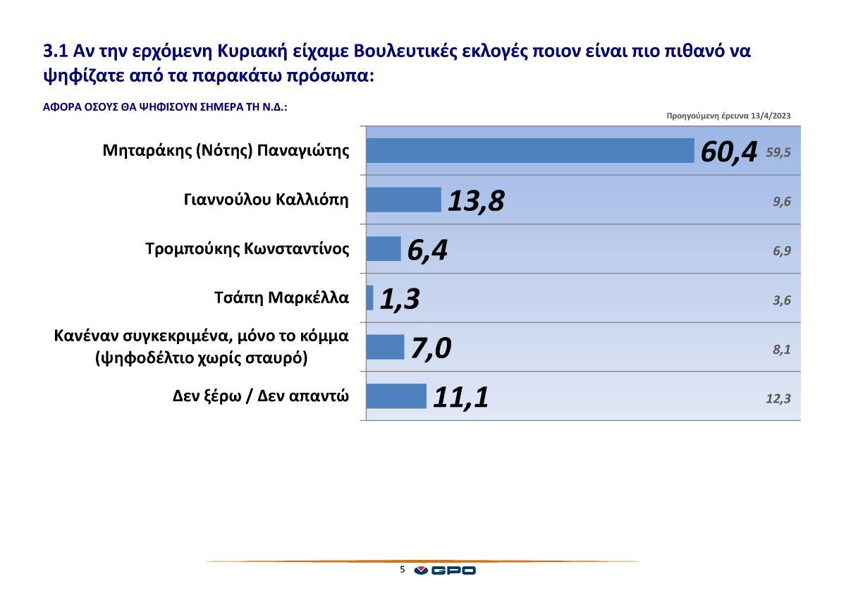 Την ίδια ώρα, στο τοπίο των υποψηφίων του κυβερνώντος κόμματος, ο υπουργός Μετανάστευσης και Ασύλου και υποψήφιος βουλευτής με τη Νέα Δημοκρατία, Νότης Μηταράκης βλέπει να παγιώνεται όχι μόνο η πρωτιά μεταξύ των ανθυποψηφίων του της ΝΔ αλλά αυτό συμβαίνει και με απόλυτο τρόπο, αφού συγκεντρώνει το 60,4% των προτιμήσεων, όταν στην τελευταία μέτρηση είχε 59,5%, αυξάνοντας δηλαδή το ποσοστό του κατά σχεδόν μία μονάδα.