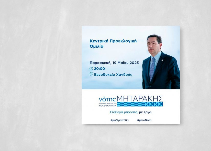 "Με ιδιαίτερη χαρά, σας προσκαλώ αύριο Παρασκευή 19 Μαΐου 2023 στις 8.00 μ.μ. στην κεντρική προεκλογική ομιλία στο Ξενοδοχείο Χανδρής.