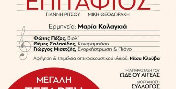 Τον εμβληματικό Επιτάφιο των Γιάννη Ρίτσου- Μίκη Θεοδωράκη θα παρουσιάσει το ωδείο Αιγέας και ο Σύλλογος Φιλολόγων Χιου την Μ. Τετάρτη στις 830μ.μ...