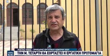 Την Μεγάλη Τετάρτη θα εορταστεί η Εργατική Πρωτομαγιά σύμφωνα με απόφαση της ΓΣΕΕ με τον πρόεδρο του Εργατικού Κέντρου Χίου Κώστα Λίνα...