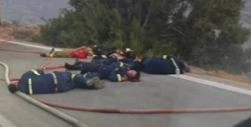 Μια εικόνα, χίλιες λέξεις… Αποκαμωμένοι από την υπερπροσπάθεια απέναντι στην πύρινη λαίλαπα στη Χίο, πυροσβέστες ξάπλωσαν καταγής για να ξαποστάσουν-...