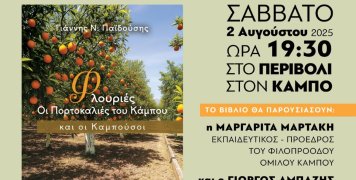 Το βιβλίο "Φλουριές, οι πορτοκαλιές του Κάμπου" του Γιάννη Παϊδούση, από τις εκδόσεις ΑΠ, θα παρουσιαστεί το Σάββατο 2 Αυγούστου...