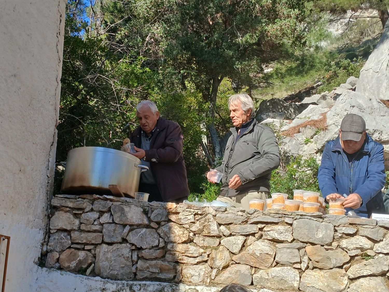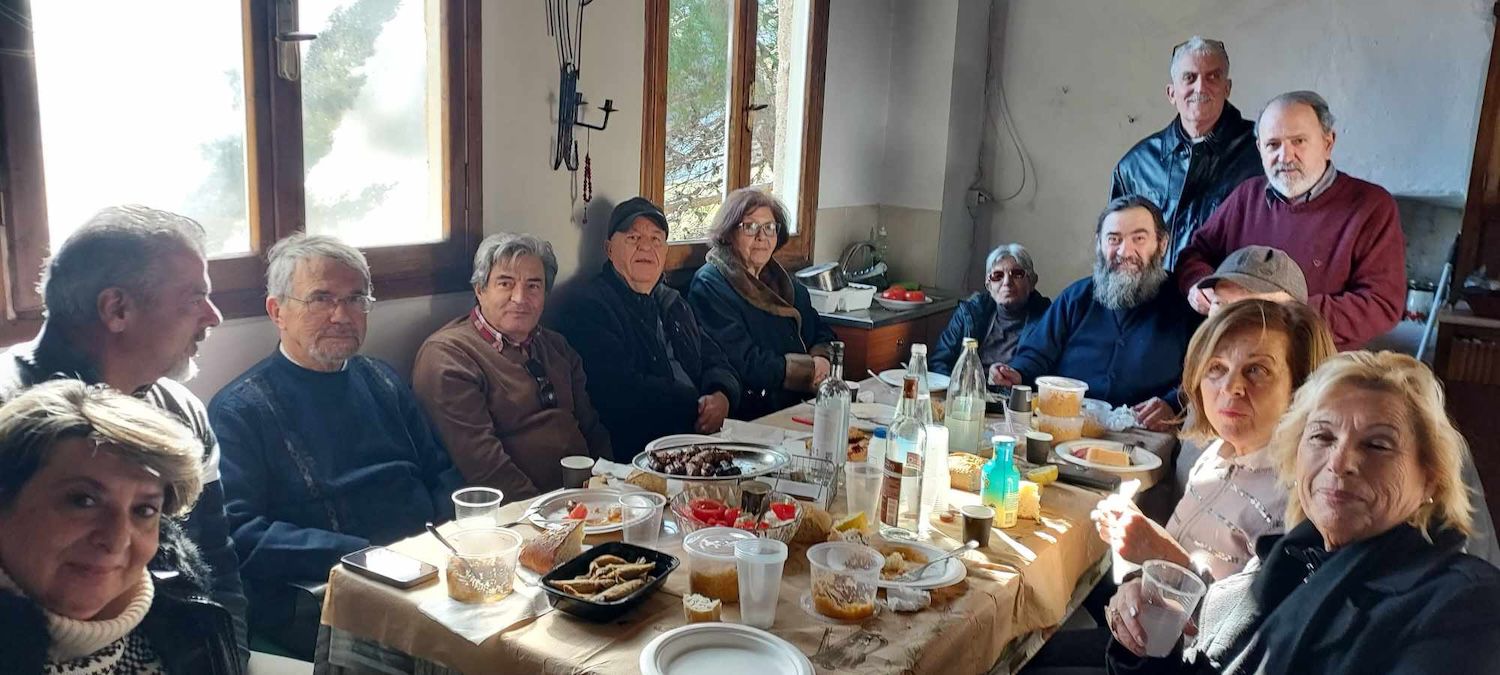 Εκκλησάκι δεν έβλεπα, αλλά σε λίγο η πρώτη εικόνα ήταν ένα καλαίσθητο γεφυράκι πάνω από ένα ποταμάκι. Η δεύτερη, σε λίγο, το εκκλησάκι, δύο επί τρία, αλλά και ένα μεγάλο καζάνι στα ξύλα με αχνιστό ρεβυθοπίλαφο. Ωχ, σκέφτηκα, εδώ θα τρώει η μάννα και δεν θα δίνει του παιδιού της. Και στην αυλή πολλοί πιστοί με ευλάβεια. Βολευτήκαμε σε ένα από τα τρία κελιά, σ’ αυτό του Στράτου, περιμένοντας την απόλυση για να αρχίσει το «πατιρντί», με την καλή έννοια του όρου. Καφές, άρτος με λουκούμι, κόλλυβα, λουκουμάδες… Και με την απόλυση να τα κιασεδάκια με ένα ρεβυθοπίλαφο να γλείφεις τα δάχτυλά σου. Κόψανε και την βασιλόπιτα, που ευλόγησε ο πάτερ Διονύσιος και το τραπέζι άρχισε να κατακλύζεται με πλούσια τα ελέη. Να και τα ούζα, τα τσίπουρα και οι σούμες. Να και τα ψητά στο τζάκι. Ε, δεν θέλει και πολλά άλλα ο άνθρωπος να αρχίσει να αισθάνεται χαρούμενα και μάλιστα με τέτοια παρέα. Όμορφη περιρρέουσα ατμόσφαιρα, φιλική συντροφιά, πλατειά χαμόγελα.