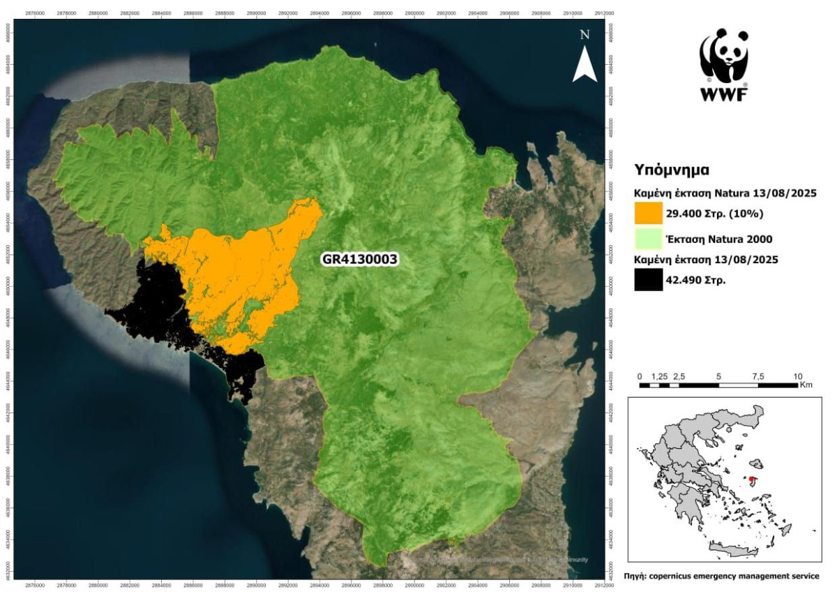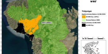 Νεότερος χάρτης του WWF Ελλάς, τον οποίο προδημοσιεύει το in, δείχνει πως στα 3.800 καμένα στρέμματα του Ιουνίου, προστέθηκαν μετά την πυρκαγιά του Αυγούστου άλλα 29.400 στρέμματα σε εκτάσεις Natura.