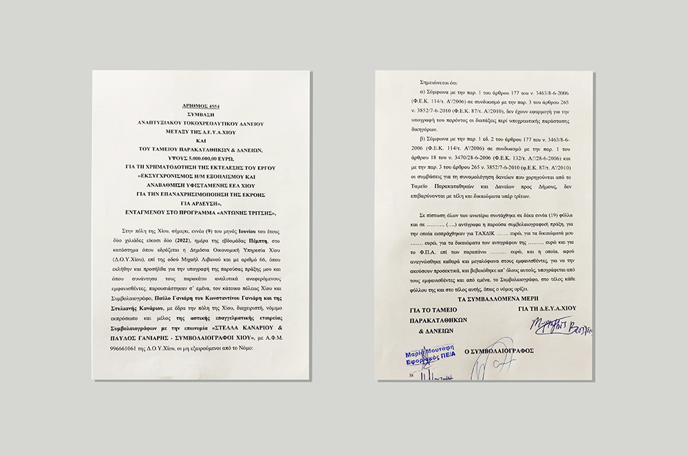 Η επανάχρηση των νερών της Μονάδας Βιολογικού Καθαρισμού Χίου, έργο που συζητείται χρόνια τώρα, μπαίνει στην τελική ευθεία, μετά την υπογραφή σήμερα της σύμβασης αναπτυξιακού τοκοχρεολυτικού δανείου μεταξύ της ΔΕΥΑ Χίου και του Ταμείου Παρακαταθηκών και Δανείων, ύψους 5 εκατομμυρίων ευρώ.