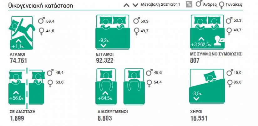 Ενδιαφέρον παρουσιάζουν τα στοιχεία της απογραφής του 2021 όσον αφορά την οικογενειακή κατάσταση των κατοίκων στο Βόρειο Αιγαίο. Μέσω αυτών πληροφορούμαστε ότι όσοι σχεδόν είναι οι άντρες είναι και οι γυναίκες -97.765 και 97.178, αντίστοιχα- οι διαζευγμένοι είναι 8.803 (περισσότερες είναι οι γυναίκες), οι έγγαμοι 92.322 και οι άγαμοι 74.761, ενώ οι χήρες και οι χήροι είναι 16.551 εκ των οποίων η μειοψηφία είναι οι άνδρες με αναλογία 85 - 15!