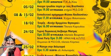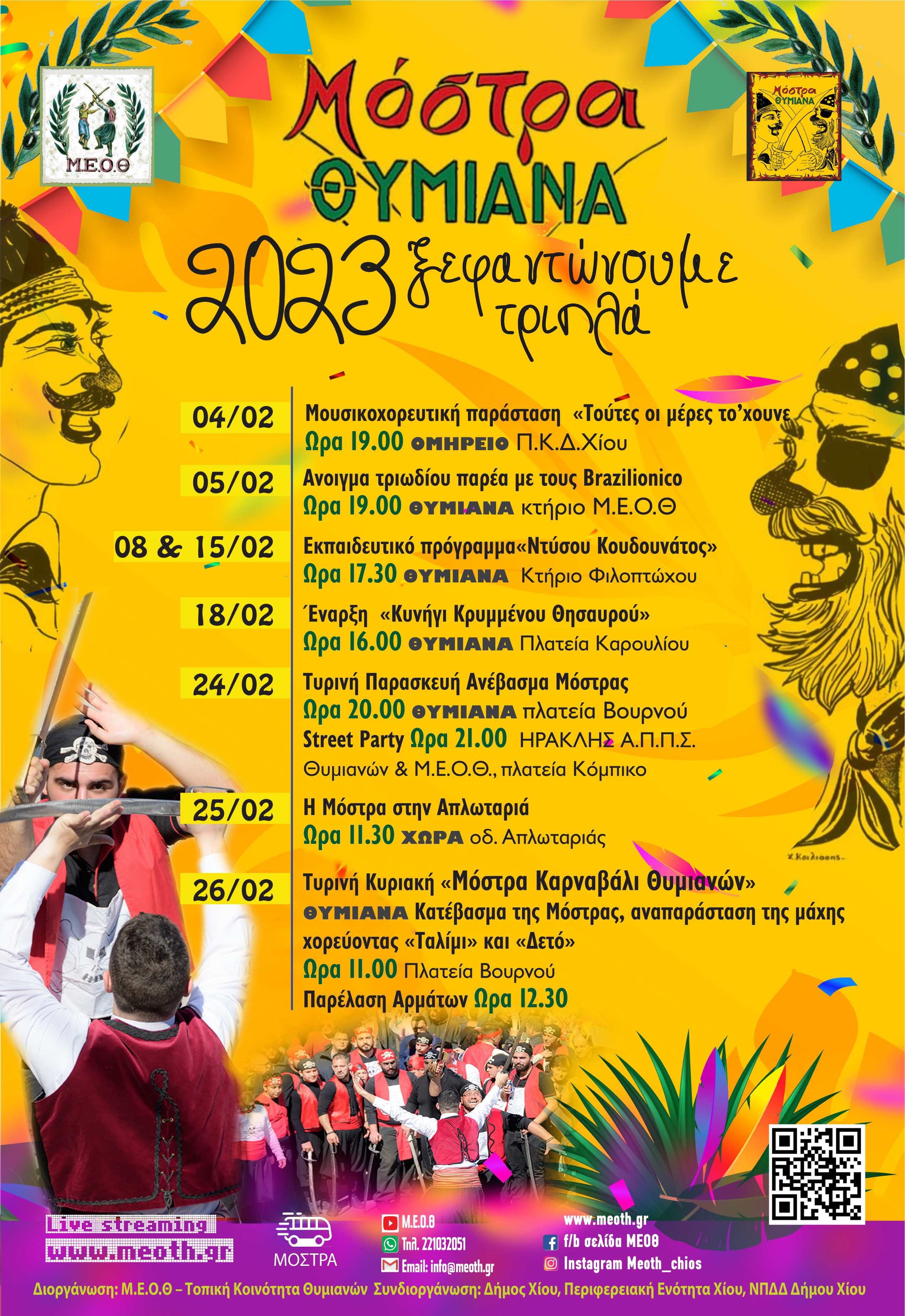 Σημειώνεται ότι επισήμως οι εκδηλώσεις του ΜΕΟΘ ξεκινούν το Σάββατο 4 Φεβρουαρίου, στις 7 μ.μ. στο Ομήρειο με χορευτική παράσταση με αποκριάτικα δρώμενα και την Κυριακή 5 Φεβρουαρίου, στις 7μ.μ. προγραμματίζεται εκδήλωση στα Θυμιανά. Παράλληλα θα τρέχουν εκπαιδευτικά προγράμματα για τη Μόστρα και τους κουδουνάτους.