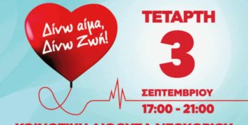 Η Νοσοκομειακή Υπηρεσία Αιμοδοσίας Χίου ενημερώνει ότι την Τετάρτη 3 Σεπτεμβρίου θα πραγματοποιηθεί Εθελοντική Αιμοδοσία με την υποστήριξη του Πολιτιστικού Επιμορφωτικού Συλλόγου Νεοχωρίου «Άγιος Μηνάς» στην Κοινοτική Αίθουσα Νεοχωρίου από τις 17:00 μ.μ. έως 21:00 μ.μ..