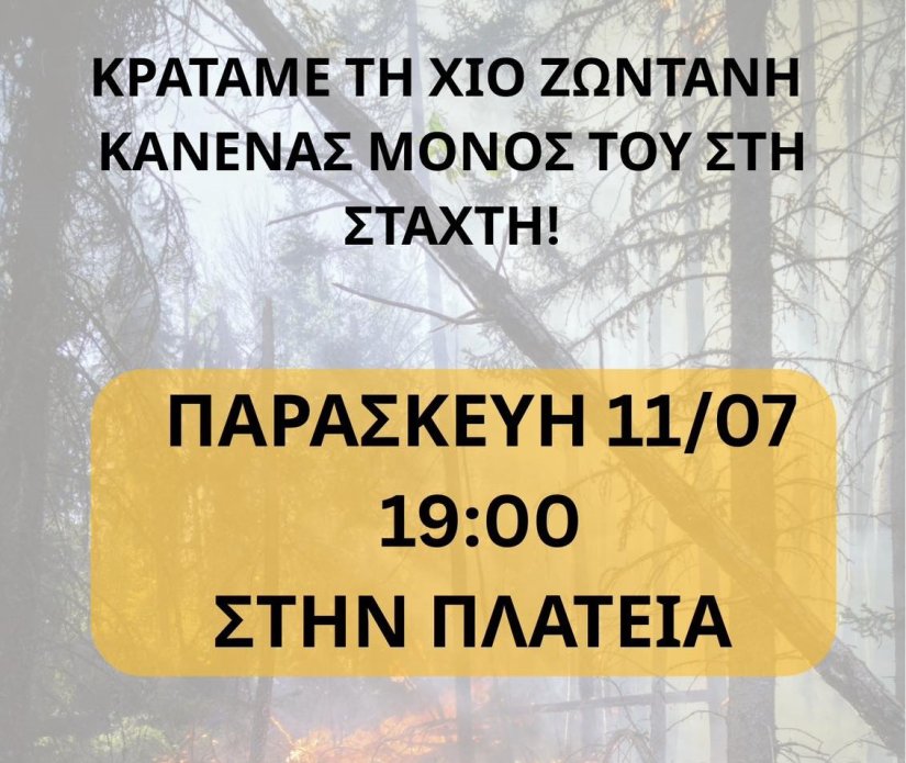 Νομαρχιακό Τμήμα Χίου της ΑΔΕΔΥ, σωματεία και φορείς καλούν σε κινητοποίηση την Παρασκευή 11 Ιουλίου, στην κεντρική πλατεία της πόλης ζητώντας την αποζημίωση των πληγέντων από την πυρκαγιά που έπληξε το νησί μας αλλά και τη λήψη μέτρων πρόληψης.
