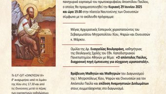 Ο εορτασμός θα γίνει - όπως κάθε χρόνο- στην πλατεία Ναυτοσύνης τη Δευτέρα 29 Ιουνίου στις 7 μ.μ. προεξάρχοντος του Σεβ. Μητροπολίτου Χίου, Ψαρών και Οινουσσών κ. Μάρκου.