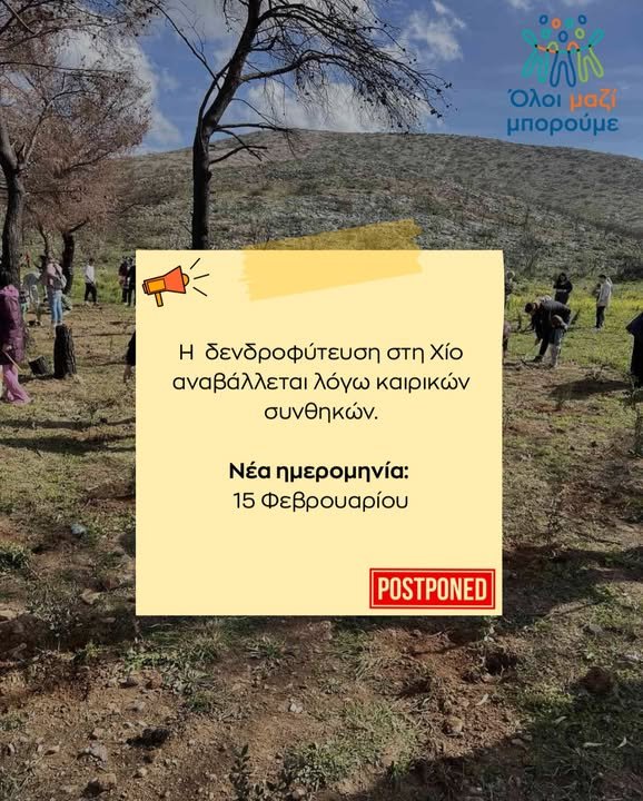 Λόγω των αναμενόμενων καιρικών συνθηκών η δενδροφύτευση του ΟΛΟΙ ΜΑΖΙ ΜΠΟΡΟΥΜΕ της Κυριακής από Ράδιο αλήθεια, Σκάϊ, Δήμο Χίου και Δασική υπηρεσία στον Άγιο Δημήτριο τσαγκαράδων, μετατίθεται την Κυριακή 15 Φεβρουαρίου στις 11.00 π.μ.