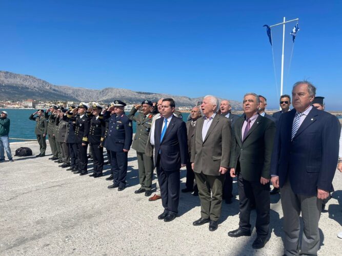 Στην έπαρση της σημαίας, που βρίσκεται πλέον σε μόνιμο ιστό, ύψους 22 μέτρων, που κατασκευάστηκε από τον Δήμο Χίου, και καταλαμβάνει έκταση 80-100 μέτρων, παραυρέθηκε ο Υπουργός Μετανάστευσης και Ασύλου Νότης Μηταράκης, ο Δήμαρχος Χίου Σταμάτης Κάρμαντζης, ο Περιφερειάρχης Βορείου Αιγαίου Κώστας Μουτζούρης, ο Στρατιωτικός Διοικητής Ταξίαρχος Χαράλαμπος Αμπατζίδης και οι λοιπές αρχές.