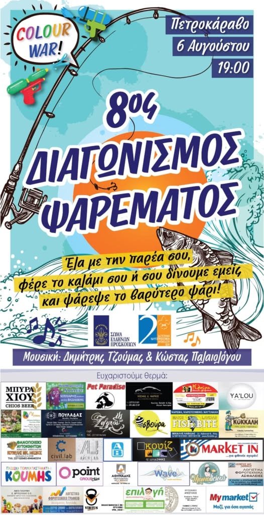 Όπως ενημερώνει το 2ο Σύστημα Ναυτοπροσκόπων Βροντάδου Χίου, η αντίστροφη μέτρηση για τον 8ο διαγωνισμό ψαρέματος και χρωματοπόλεμου ξεκίνησε!!!
