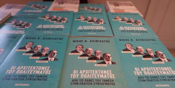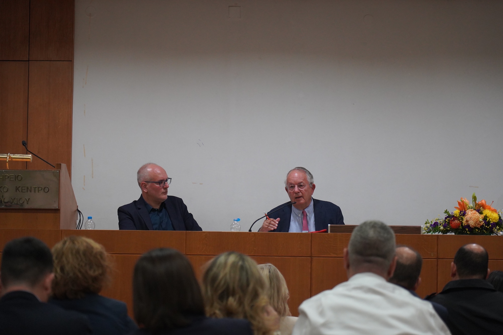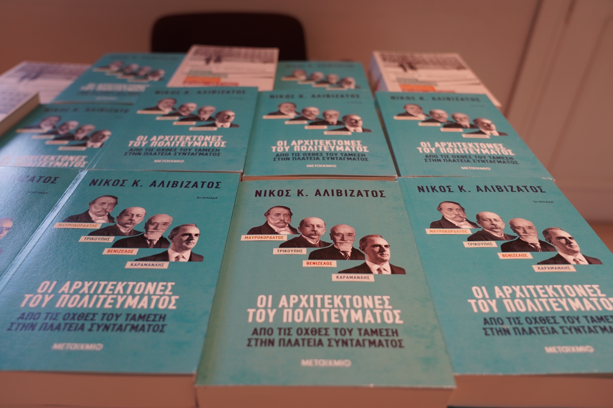 Αμέσως μετά ακολούθησε συζητηση με θέμα «που πάει το πολίτευμά μας σήμερα και ποια η θέση της δικαιοσύνης» μεταξύ του Νίκου Αλιβιζάτου, Ομότιμου Καθηγητή Συνταγματικού Δικαίου και του Γιώργου Κουκουράκη, αναπληρωτή Δ/ντή του Εθνικού Ιδρύματος Ερευνών και Μελετών «Ελευθέριος Βενιζέλος», με αφορμή το βιβλίο του κ. Αλιβιζάτου «Οι Αρχιτέκτονες του πολιτεύματος».