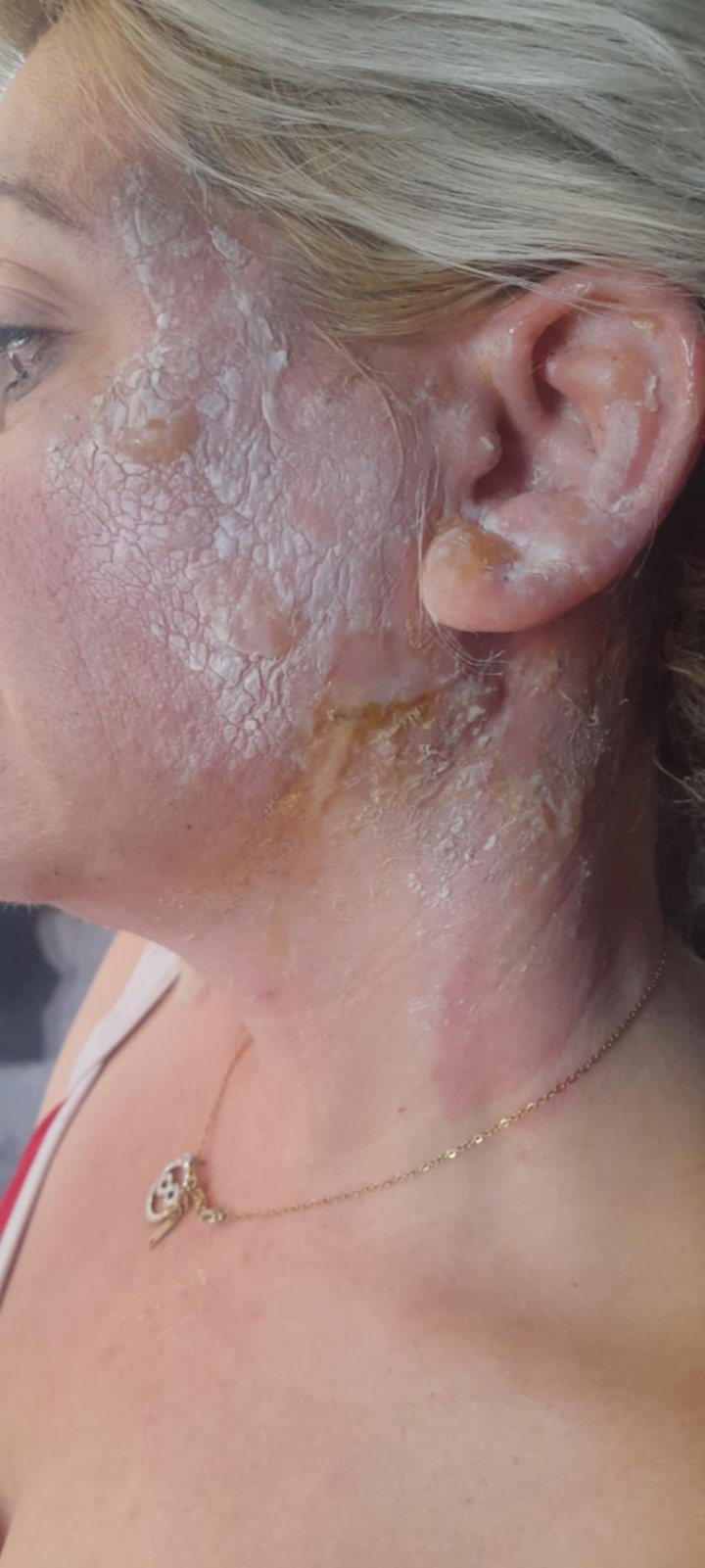 Με καμένη την αριστερή πλευρά του προσώπου της, με φούσκες γεμάτες πύον που είχαν αρχίσει ήδη να εμφανίζονται κατά την μεταφορά τους με το σκάφος του Λιμενικού να εμφανίζονται, έφυγε από τα ΕΠΕΙΓΟΝΤΑ του Νοσοκομείου, με μια γνωμάτευση για ΕΓΚΑΥΜΑΤΑ ΔΕΥΤΕΡΟΥ ΒΑΘΜΟΥ στο πρόσωπο και τον λαιμό.