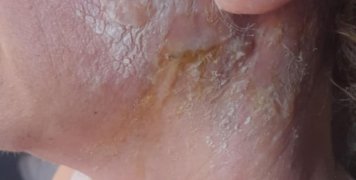 Μου δείχνει τις φωτογραφίες. Το έγκαυμα της, από τις πρώτες μέρες, με τις φούσκες γεμάτες πύον να καλύπτουν το αριστερό αυτί της, το μάγουλο της και ένα μέρος του λαιμό της. Σοκάρομαι αλλά δεν πρέπει να φανεί.