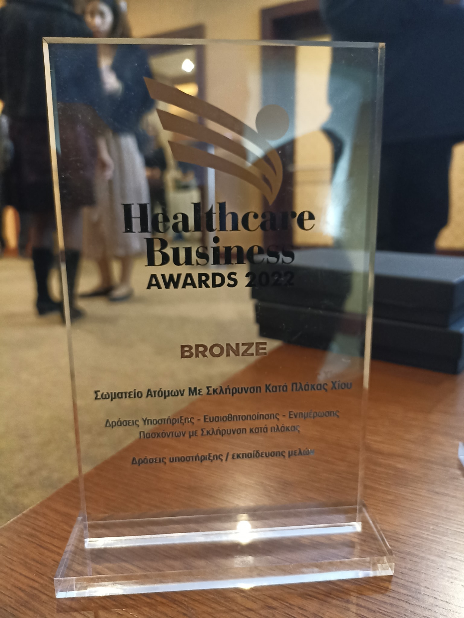 Το Σωματείο Ατόμων με Σκλήρυνση Κατά Πλάκας Χίου συμμετέχοντας για 1η φορά στα Healthcare Business Awards τιμήθηκε με BRONZE βραβείο στην ενότητα Δράσεις υποστήριξης - εκπαίδευσης μελών και με GOLD βραβείο στην ενότητα Δράσεις με στόχο την ενημέρωση - ευαισθητοποίηση - πρόληψη.