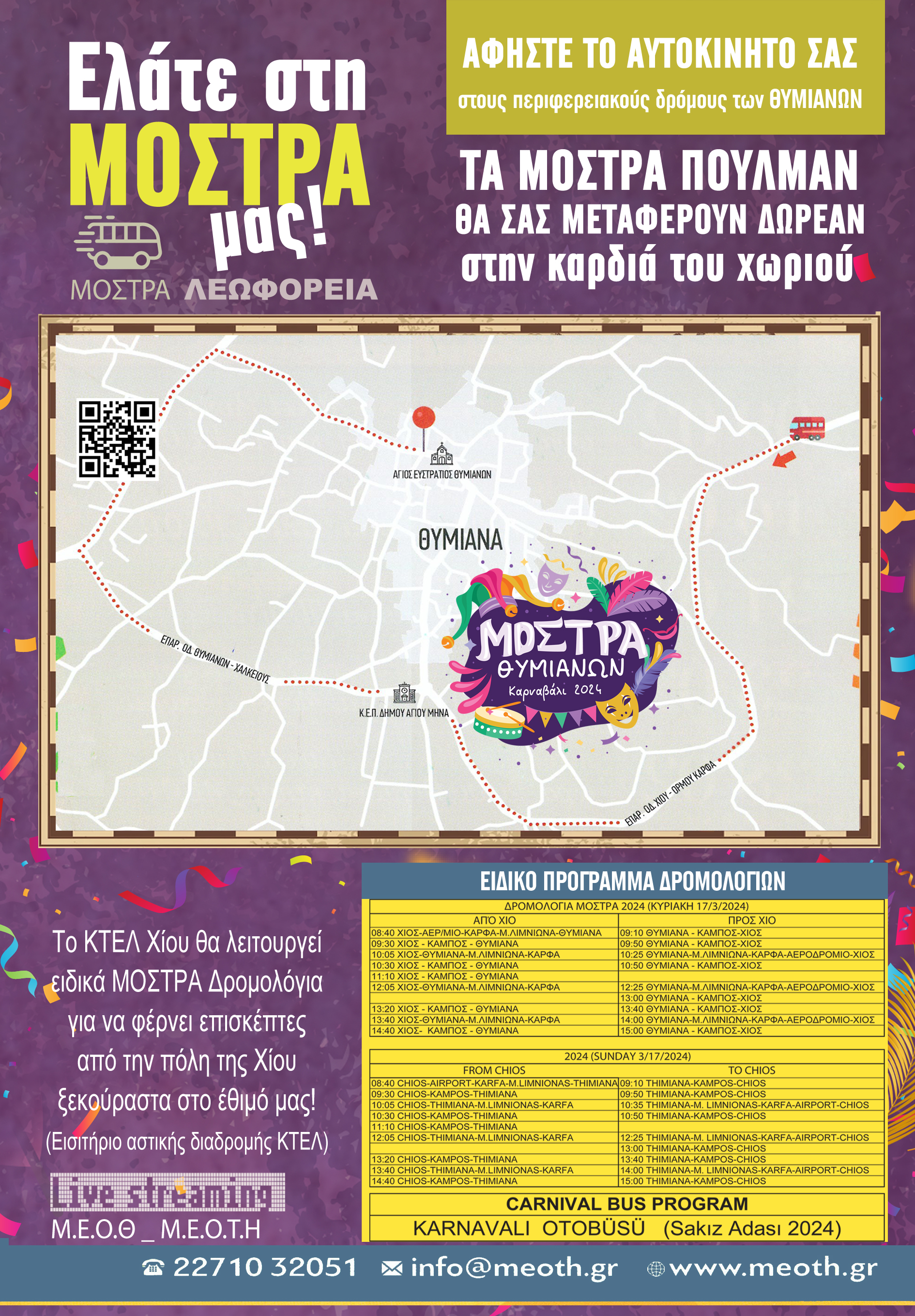 2ος τρόπος: Σε συνεργασία με το Αστικό Κτέλ Χίου Α.Ε έχει δρομολογηθει ειδικό Μόστρα εορταστικό πρόγραμμα και με Εισιτήριο Αστικής γραμμής ο επισκέπτης/τρια έρχεται ξένοιαστα για να διασκεδάσει και να δει το μοναδικό έθιμο της Μόστρας και το Καρναβάλι Θυμιανών. Περισσότερες πληροφορίες σχετικά με τα δρομολόγια θα βρειτε στην ιστοσελίδα του Αστικού Κτελ: https://chioscitybus.gr/dromologia/