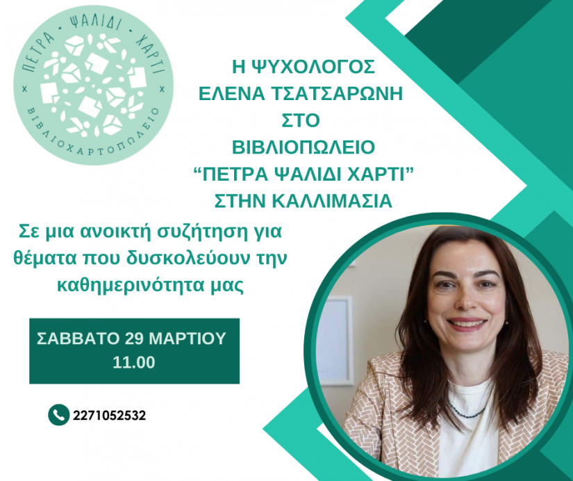 Το Σάββατο 29 Μαρτίου 2025, στις 11.00 στο βιβλιοπωλείο «ΠΕΤΡΑ, ΨΑΛΙΔΙ, ΧΑΡΤΙ» στην Καλλιμασιά η ψυχολόγος Έλενα Τσατσαρώνη απαντά στα ερωτήματα σας, σε μια ανοικτή συζήτηση για το πώς θα βελτιώσουμε την καθημερινότητα μας.