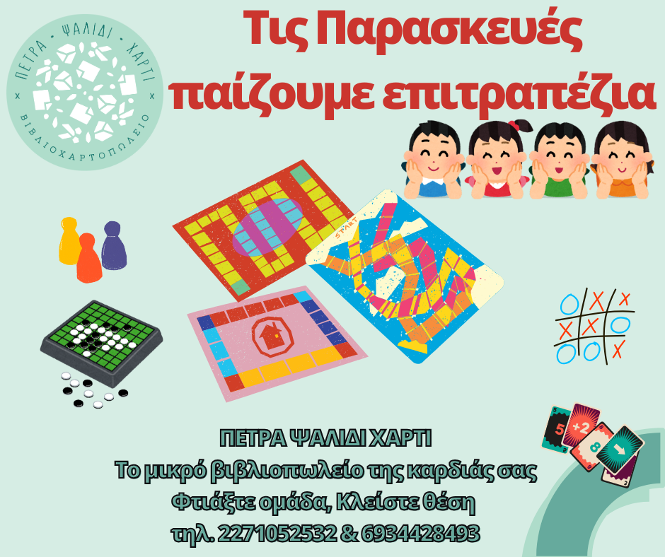 Επίσης κάθε Παρασκευή 17.30-20.30 στο βιβλιοπωλείο "Πέτρα, Ψαλίδι, Χαρτί" πραγματοποιείται η δράση, «Τις Παρασκευές παίζουμε» κατά την οποία τα παιδιά από 4 ετών και πάνω, ανά ηλικιακές ομάδες παίζουν επιτραπέζια παιχνίδια, στο αναγνωστήριο του βιβλιοπωλείου μας.