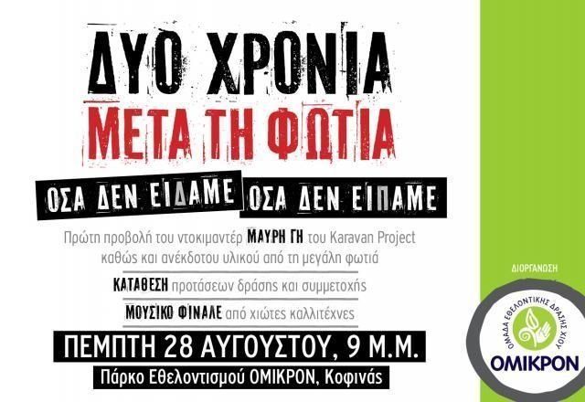 Την Πέμπτη 28 Αυγούστου στις 9 το βράδυ στο Πάρκο Εθελοντισμού "ΟΜΙΚΡΟΝ" θα συναντηθούμε για να θυμηθούμε τα γεγονότα αλλά και το μετά μέσα από την ευαίσθητοποιημένη ματιά των καλλιτεχνών του Caravan Project που θα μας παρουσιάσουν για πρώτη φορά στη Χίο το ντοκιμαντέρ "ΜΑΥΡΗ ΓΗ" αλλά και ανέκδοτο υλικό που κατέγραψαν με το φακό τους.