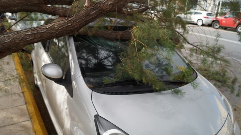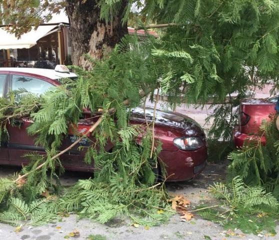 Επίσης από πτώση δέντρου και συγκεκριμένα από αλμυρίκι, προκλήθηκαν ζημιές σε σταθμευμένο όχημα έξω από τη μονάδα του Βιολογικού, στο αεροδρόμιο.