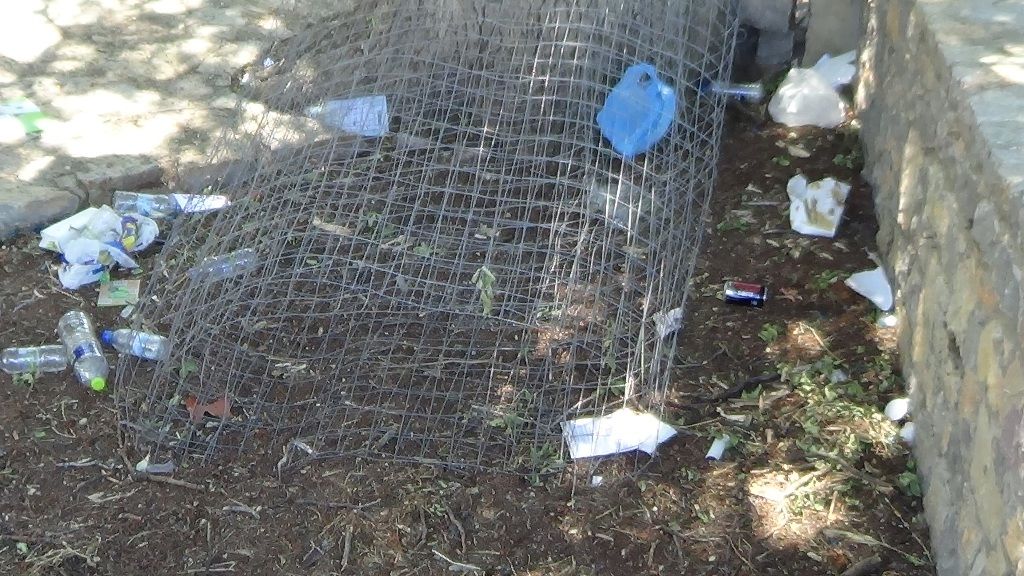 Οι εικόνες μιλούν από μόνες τους. Σκουπίδια παντού, αποφάγια, αναψυκτικά χυμένα, ιδανικός μαγνήτης για σφήκες. Και το ερώτημα είναι: Ποιοι τα κάνουν αυτά; Οι ηθοποιοί αποκλείεται είναι επί σκηνής, άρα… ας διαλέξουμε ποιο ζωάκι μας μοιάζει. Υπ’ όψιν στην είσοδο των κερκίδων υπάρχουν δύο μικροί κάδοι απορριμμάτων και οι δύο… άδειοι.