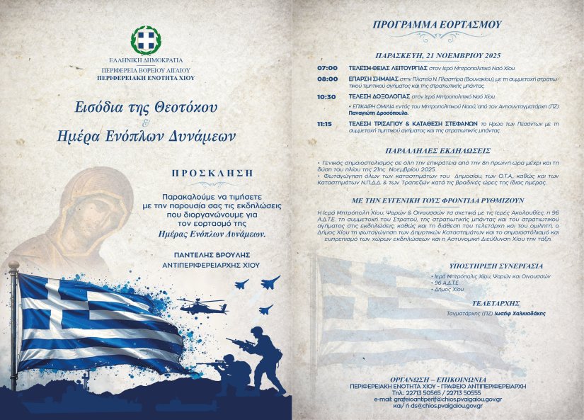 Η Περιφερειακή Ενότητα Χίου τιμά την Ημέρα των Ενόπλων Δυνάμεων, ανήμερα της Εορτής των Εισοδίων της Θεοτόκου, την Παρασκευή 21 Νοεμβρίου 2025.