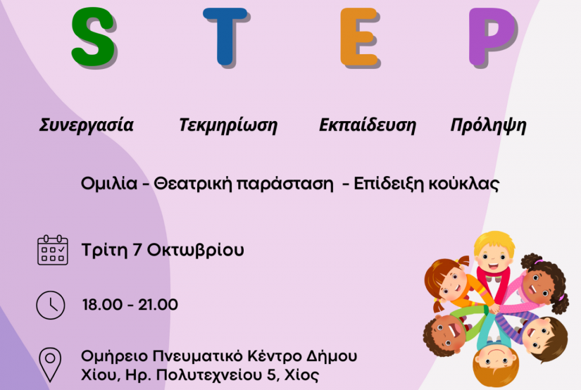 Το έργο «Μαζί ενάντια στη βία κατά των παιδιών στο Βορειοανατολικό Αιγαίο – STEP» έρχεται στη Xίο για μια εκδήλωση ενημέρωσης και ευαισθητοποίησης με στόχο την πρόληψη και καταπολέμηση της βίας κατά των παιδιών, που θα πραγματοποιηθεί την Τρίτη 7 Οκτωβρίου, στις 6 μ.μ. στο Ομήρειο.