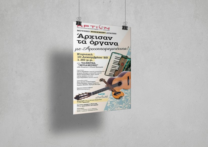 Με αρχοντορεμπέτικα τραγούδια ο Πολιτιστικός Σύλλογος «ΑΡΤΙΟΝ» διοργανώνει ένα μουσικοχορευτικό μεσημέρι την Κυριακή, 10 Δεκεμβρίου 2023, στη 1.30 μ.μ. στην Ταβέρνα του Μπάμπη, οδός Νεωρίων 5 - Παλιά Προκυμαία, με κουμπαρά υπέρ του Κέντρου Ημέρας Χίου - Αποστολή.