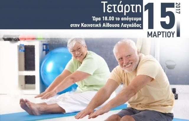 Η εκδήλωση θα πραγματοποιηθεί την Τετάρτη 15 Μαρτίου στις 6 μ.μ. στην Κοινοτική αίθουσα Λαγκάδας και εντάσσεται στο πλαίσιο του προγράμματος του Υπουργείου Υγείας «Οργάνωση και Ανάπτυξη Εθνικού Πιλοτικού Προγράμματος Προαγωγής της Υγείας των Ηλικιωμένων Ατόμων – Ηπιόνη» .